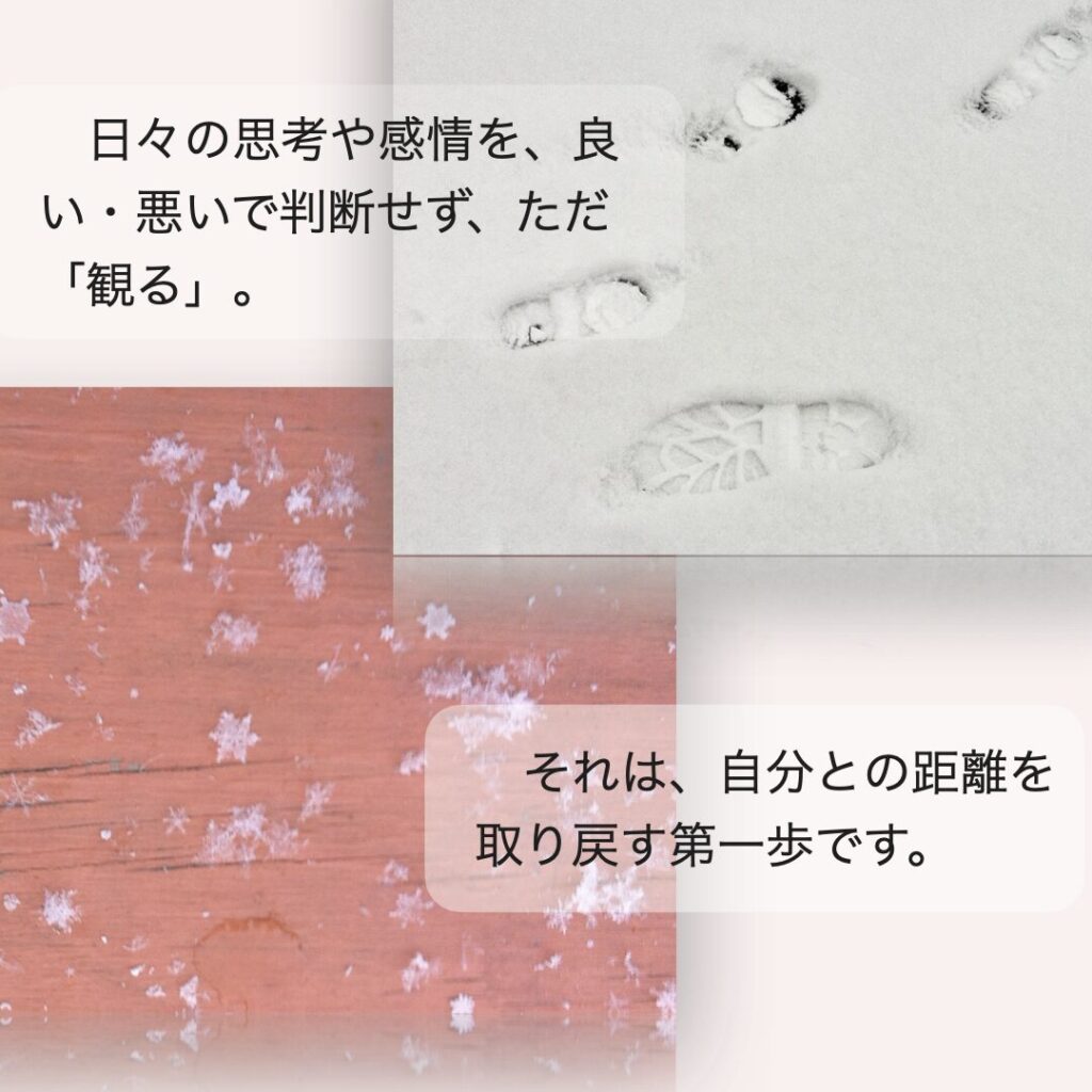 例えば、心の中に不安や焦りが湧いてきたとき。 私たちはつい「こんな風に思ってはいけない」「もっと前向きにならなければ」と自分を評価(ジャッジ)してしまいます。しかし、マインドフルネスの視点では、その感情をただ「あ、今自分は不安を感じているな」と、雪の上に残った足跡を眺めるように客観的に観測します。